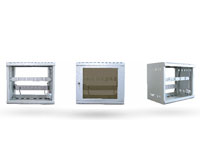 The wall mount rack structure is a welded frame with integrated side panels, vented top cover with fan mounting provision along with front glass door with lock and key provision. |